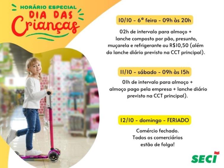 Nos dias que antecedem o 12 de outubro, Dia das Crianças, as lojas de rua do comércio de Ipatinga funcionam nos seguintes horários: